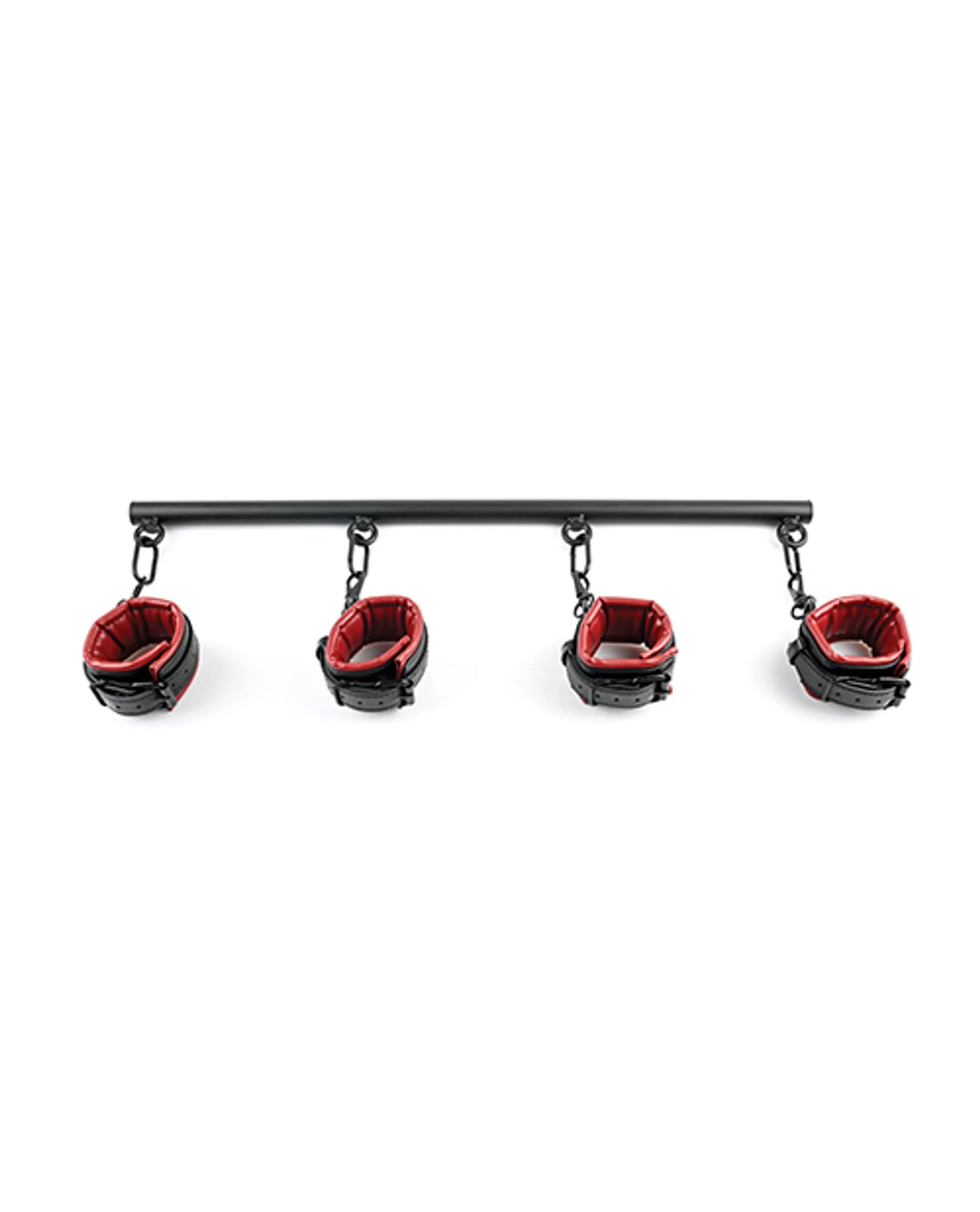 Saffron Spreader Bar and Cuff Set from Sportsheets. Act out your naughtiest power play fantasies with the Saffron Spreader Bar and Cuff Set. Four faux leather, lightly padded adjustable cuffs in the signature red and black of the Saffron collection buckle comfortably around your wrists and ankles and clip to the spreader bar and each other in any way you can dream up. The strong, solid spreader bar's rings are firmly welded in place, so there's no escape, only release. Imagine your ankles cuffed to the farthest ends of the spreader bar, leaving your most luscious bits on display and accessible for your lover's wicked pleasure, or your arms spread and immobilized while they tease and torment every inch of you. The spreader bar's four attachment points and the swivel snap clips on each cuff even make hog tying or multiple partner play possible. Mix and match with other Saffron collection products for even more forbidden fun! About the Saffron collection: Saffron is a thoughtfully crafted line of couples friendly vegan products designed for players at every level of interest and experience. Created with beauty, comfort, and safety in mind, Saffron is perfect for anyone who desires to explore a new kind of give and take in the bedroom. Adjustable Cuffs fit most users. Swivel snap clips make any position possible. Vegan/Vegetarian Friendly Faux Leather. Nickel Free Metal. Materials: Stainless Steel, Polyurethane PU, Aluminum. Includes: One Spreader Bar with O-Rings in Matte Black 24.75 inches. Four adjustable Faux Leather Cuffs in Saffron and Black 10 inches. Sportsheets will replace any defective product. If the product is not available, Sportsheets will replace it with a similar product of similar function. Limited Lifetime Warranty, Sportsheets will replace any defective product. If the product is not available, Sportsheets will replace it with a similar product of similar function. Video. 2021.