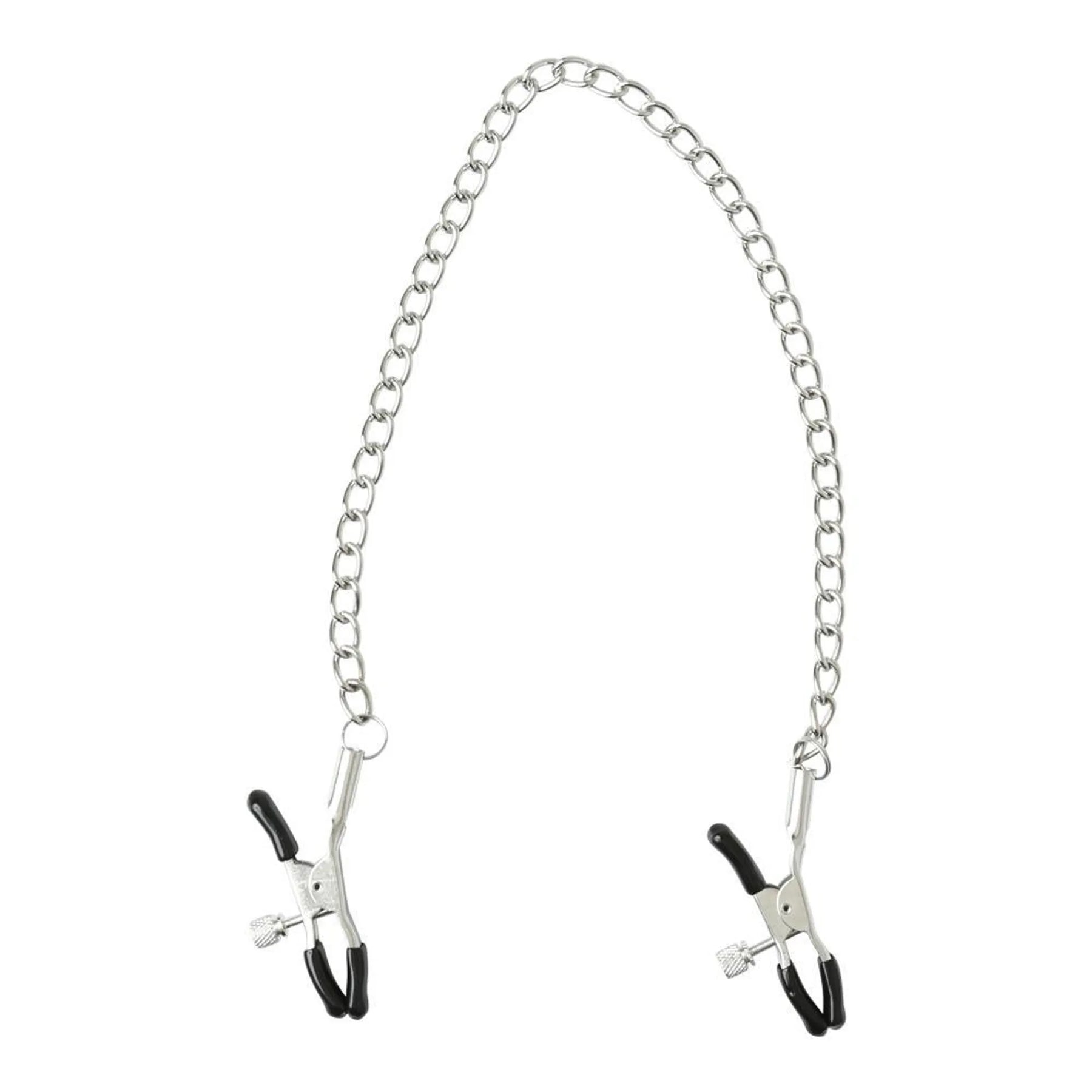 Sportsheets Sex and Mischief line Chained Nipple Clamps. Make your nipples perk with pleasure with these nipple clamps. Made with durable metal clips and covered in soft rubber liners, these clamps are perfect for beginners and fetish enthusiasts alike. The amount of pressure you apply to the nipple is adjustable by turning the screw, while the chain give you subtle stimulation with each movement. Details explore pain and pleasure with these perfect pinchers! Test your limits, or your partners, with this BDSM basic. Rubber tipped for comfort, these clamps are a great introductory accessory for those who lean towards masochist or submissive roles, though anyone can enjoy the teasing torment of nipple toys. Thumb screws allow you to adjust the pressure on each nipple, while a connector chain gives you something to tug on as climax nears. Get creative and try these clamps on other body parts! Chained Nipple Clamps specifications:materials nickel free metal, rubber. Measurements: 13 inches, 1.1 ounces. Non-piercing nipple clamps with adjustable thumb screws. Limited Lifetime Warranty, Sportsheets will replace any defective product. If the product is not available, Sportsheets will replace it with a similar product of similar function. Categories: Sex Toys for Couples, Nipple Play, Non-piercing Nipple Clamps, Sex Toys for Women, Bondage Kits, Kinky Sets. Video. Restricted, Amazon Restricted. 2022.